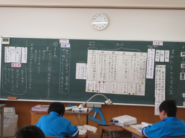 「すがたをかえる大豆」のまとめです。教室では筆者の説明の仕方の工夫についてあらためて考えていました。児童は、いろいろな食べ物の例を読んでみて、大豆のこと、すがたをかえてできた食べ物のことに興味をもつことができたようです。そして、その感想と説明の仕方の工夫点(「ここでは」学んだ内容)がつながりました。教室には、図書資料がありました(4枚目の写真)。さて、「このあとは」さらに他の「すがたをかえる○○」について調べてみたくなりましたね!