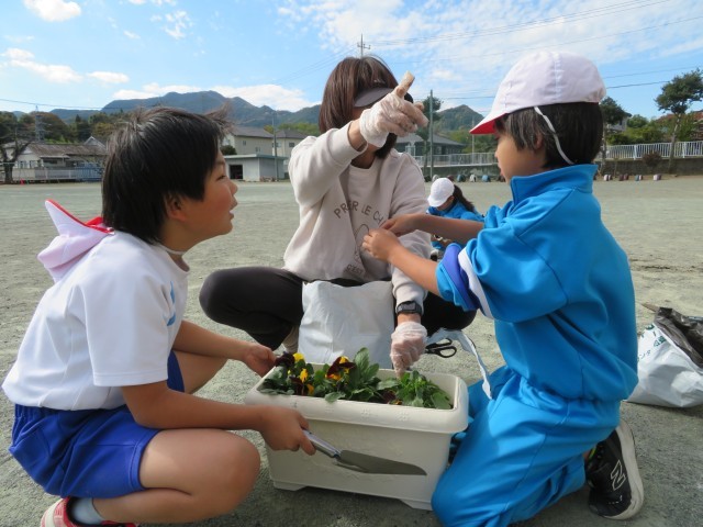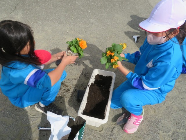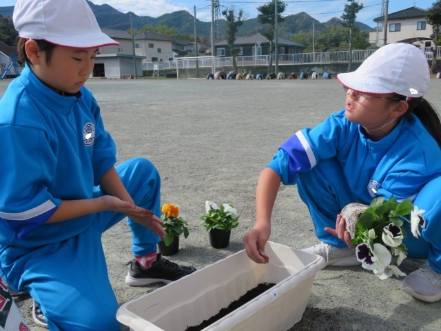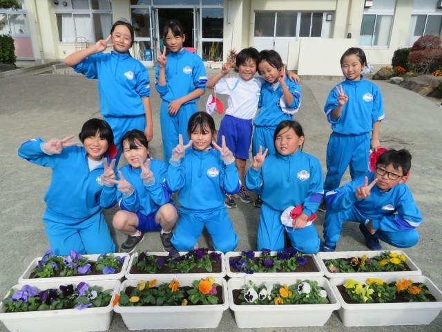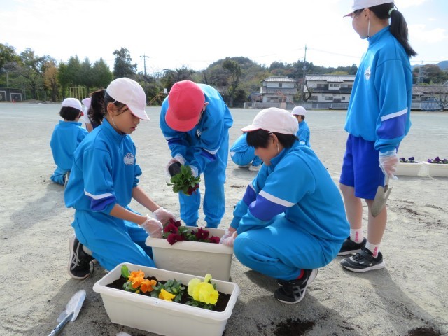 今日は4年生が作業をしました。どう配置したらきれいに見えるか?土の必要なところはどこか?友達と声をかけ合いながら和やかに、丁寧に作業することができました。とてもきれいなプランターが出来上がりました。みんなで協力して教室のベランダまで運び、毎日世話をします。これで全学年の作業が終わりました。一人一人の心のこもったプランターのパンジーがきれいに成長していく毎日を楽しみにしています。