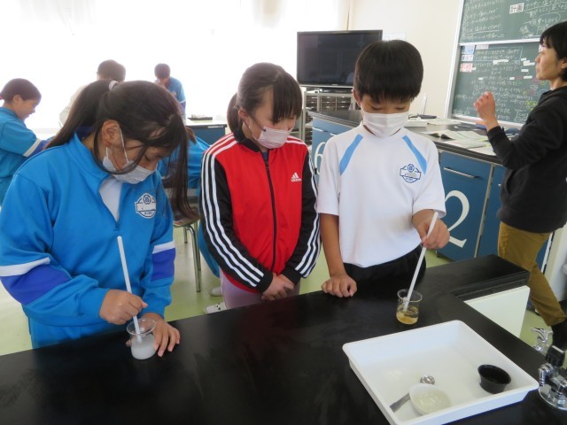 「物のとけ方」今日の問いは、「物が水にとけたとき、液の中で、とけた物はどうなっているのか?」実験では、コーヒーシュガーと片栗粉をそれぞれ水に入れてかきまぜて5分後と数日後の様子を見ます。その前に予想をしますが、その予想に、先生の想像以上に時間がかかりました。いろいろな予想が出てきました。友達の予想をよく聴いて、どんなことを伝えたかったのか?自分の予想と比較しながら聴いていました。したがって、「ここでは」実験を通した学びは確実に充実すると思います。また、実験への臨み方は素晴らしいです。すぐ実験台の上をきれいにし、濡れたところを拭くなど、安全で充実した実験をするうえで大切なことがきちんと習慣化されています。