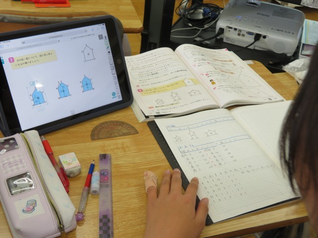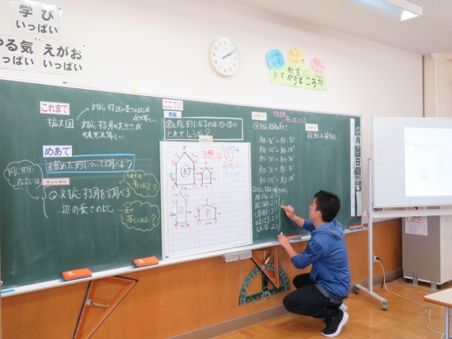 「拡大図と縮図」の学習です。今日は縮めた形について調べました。同じ形のように見えるけれど・・・でも「のように見える」ではいけません。「ここでは」きちんと「同じ形であると言える」理由とともに説明することができるようになりました。拡大図、縮図のことを学び、形の見方をさらに広げています。直接はかることはできないけれど、「ここでは」の学習を活用すれば、実際の長さを調べることができるようにもなります!」