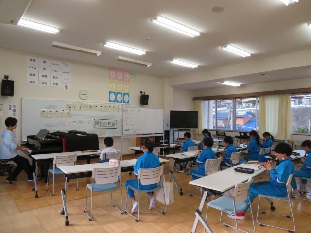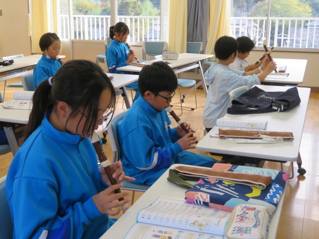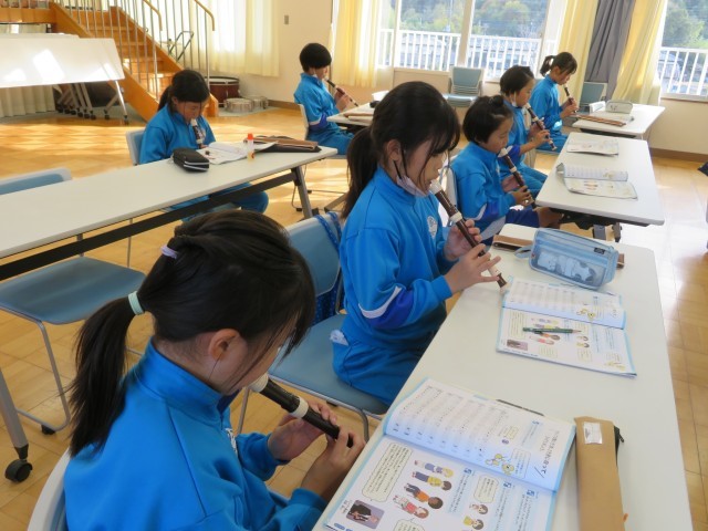 「オーラ リー」をリコーダーで上手に演奏できるようになっています。「ここでは」旋律が重なり合う美しさを感じ取りながら演奏します。そのために、必要となる技能をしっかり練習していました。「これまで」の学習のなかでできるようになった「サミング」を使う音がでてきました。先生のモデル演奏を目標にして一生懸命練習していました。