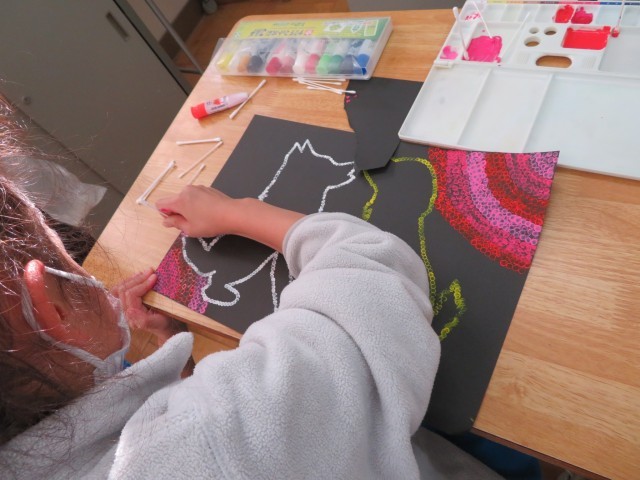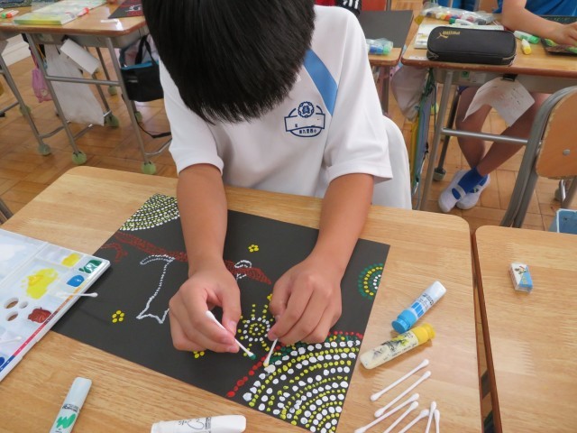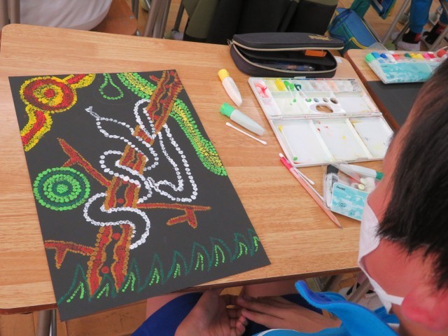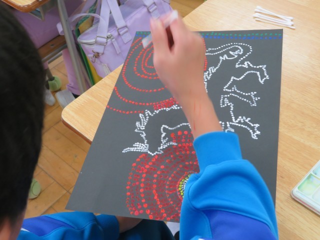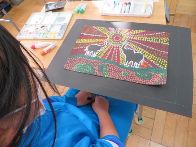 「アボリジナルアート」は完成に近付いています。さらに外枠部分をかきはじめました。自分の守り神を表す作品をさらに自分らしく引き立てることができるようなデザインと色の表し方を、じっくり考えています。真っ黒の大きな画用紙のうえに描く作品は、色を加えるにつれて、どんどん生き生きと輝きを増しているようにみえます。