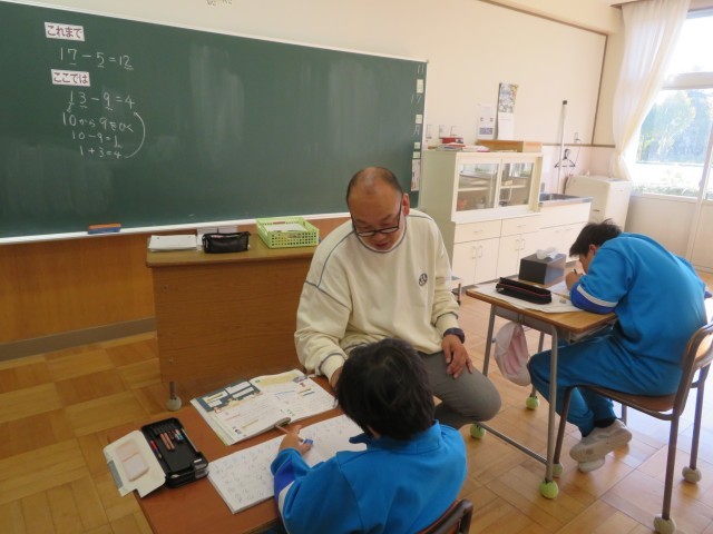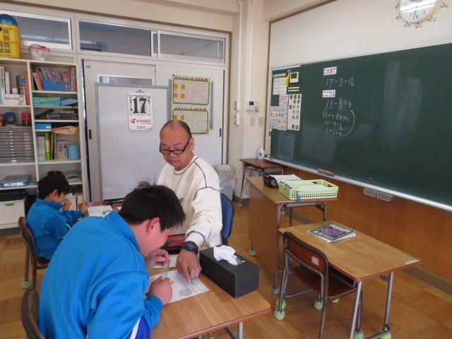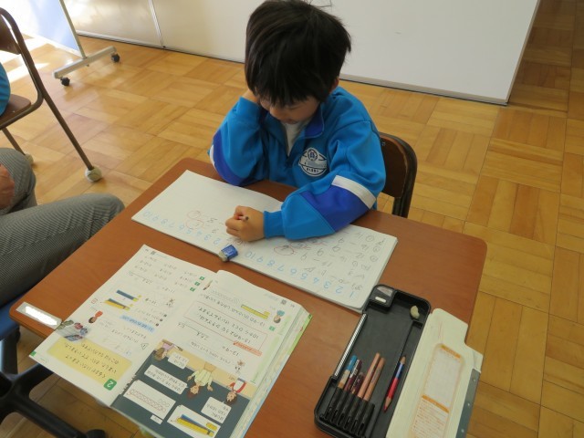 2人も算数の学習。いつも通り、最後まであきらめないで自分の力で考え抜こうと頑張っています。1年生は、13-9のようなひきざんができるようになっています。答えを出すまでの時間がだんだんと短くなってきているのは、努力の証です。