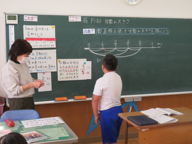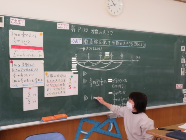 分数についての学習で、今日は、数直線を使って分数の大きさについて考えていました。1mを5等分したことを表す数直線を正しくかくことができ、一つ一つの目盛りを正しく読み取ることができました。そして、分母が同じ分数の大きさ比べでは、ただなんとなく答えるのではなく、しっかりその理由を説明することができました。分母や分子の表す意味をきちんと理解できているからです。