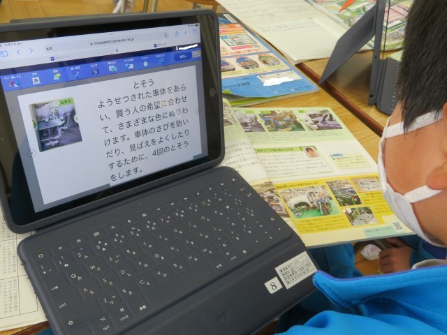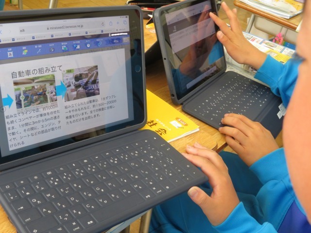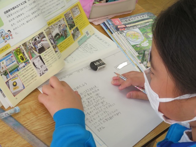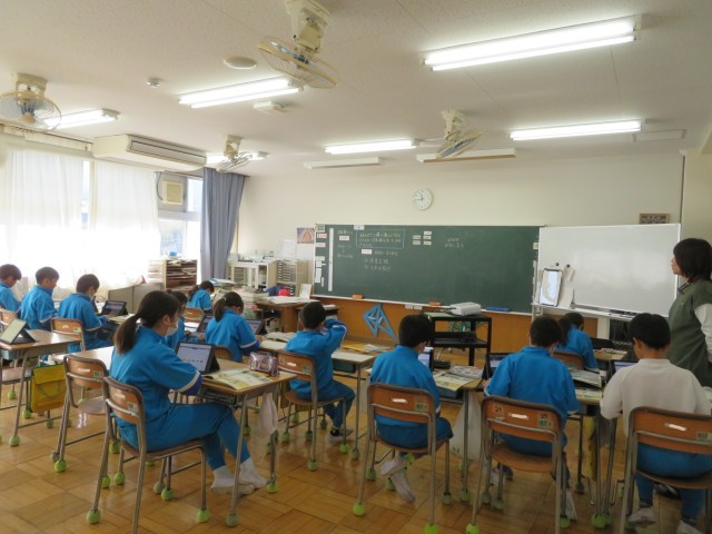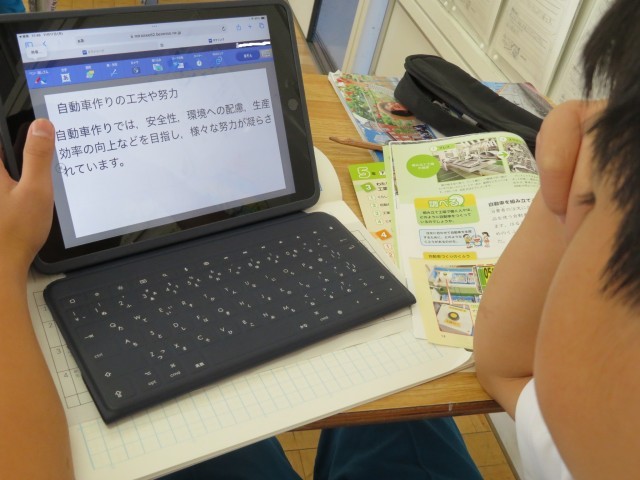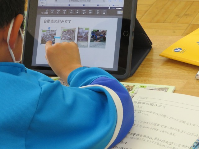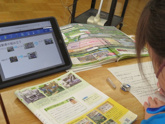 「自動車の組み立て工場で人々がどのように自動車をつくっているのか?」これが今日の学習課題です。5年生はその作業工程、働く人々の工夫や努力の2点について調べてまとめていました。ワークシート上にまとめる子、タブレット上で写真や図などを入れながらまとめる子、自分のやり方で学習を進めています。資料等からただ写すのではなく、自分できちんと読み取って理解してまとめていることがよく伝わりました。自分自身の力で「なるほどね!」「そういうことか」がうまれる学びは価値が大きいです。