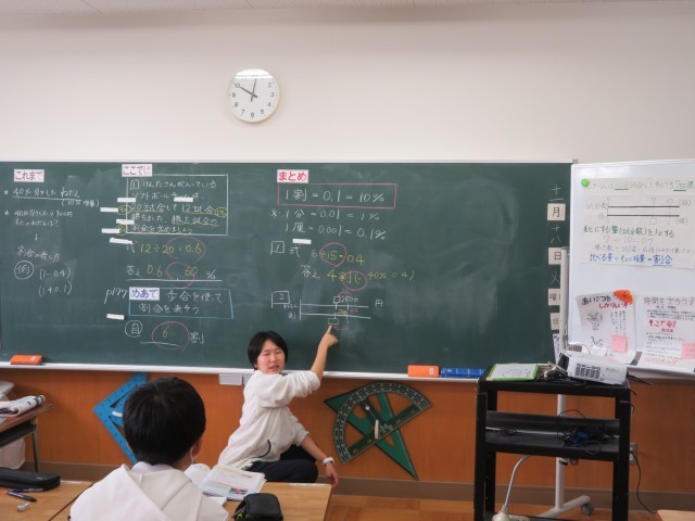 「割合」の学習の中で、今日は「歩合」という考え方を知り、歩合を使って割合を表すことができるようになりました。今日の問題は「定価2500円のスニーカーが2割引き。その値段は?」ばっちり計算できるようになりました。商品の値段や量についてなど、割り増しや割引については、私たちの生活の中ではとても重要なポイントとなっています。5年生の児童はバッチリです!よく考えてお買い物ができるようになりました。