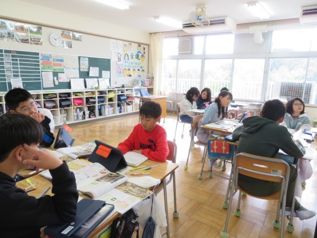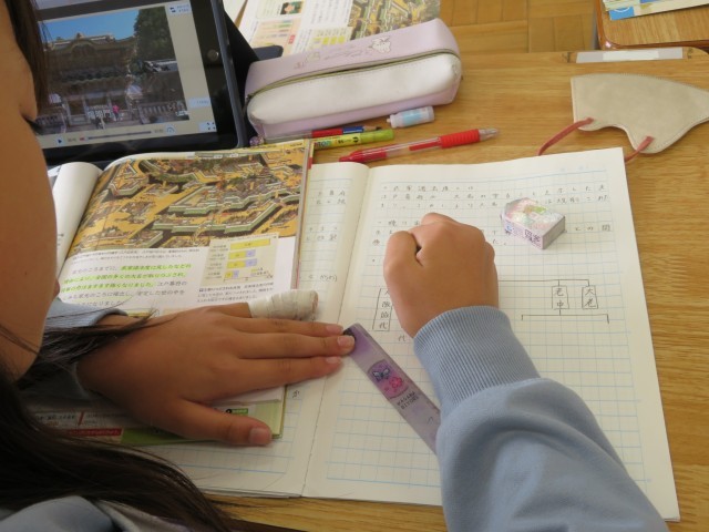 今日は、徳川家康が開いた江戸幕府が徳川家光にどう受け継がれたのか?を学習しました。教室では、武家諸法度について知り、その内容について反したために取りつぶされた大名に関する資料を見て、その資料から読み取れることをみんなで話しているところでした。とてもいいことだなあと思うのは、6年生が「どうしてだろう?」「なんでこうなるのかな?」と疑問をもって調べたり、友達と話したりする姿勢です。また、「これまで」学習した鎌倉時代の御成敗式目がつくられたときのことと比較して考えようとしている児童もいたようです。