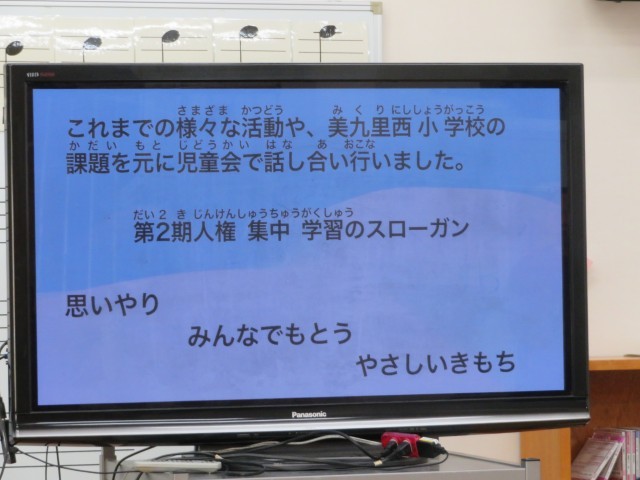 今日から、12月12日(金)までの期間、美九里西小では、児童会を中心として、みんなで「人権」について自分たちで考えて、行動を起こします。今朝はそのスタートとして、児童会から様々な活動の提案がありました。テーマは「思いやり みんなでもとう やさしい きもち」です。9月の「いじめ防止フォーラム」や先日の「東一貫校人権サミット」での内容を受けて、児童会からは一人一人が、そして各学級で考えてほしいことを伝えました。その他にもいろいろな実践をします。最後に、校長の話の中で、児童、教職員みんなで、「みんなが幸せに生きるための大切な約束(人権)」を確認しました。