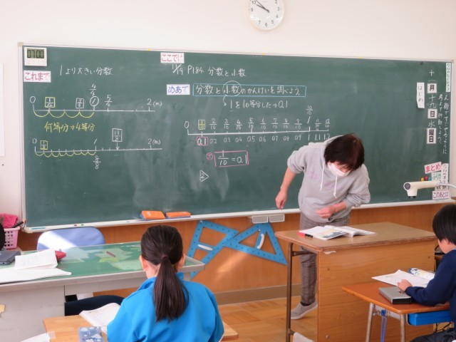 「分数」の学習を頑張っています。今日は、分数と小数の関係を調べました。数直線上で考えてみると・・・10分の1と0.1は等しい大きさであることが分かりました。するとどんどん数直線上の数を分数と小数の両方で読むことができます。「できた!」「かんたんだね!」がどんどん3年生の「やる気いっぱい」につながっていることがよく伝わりました。
