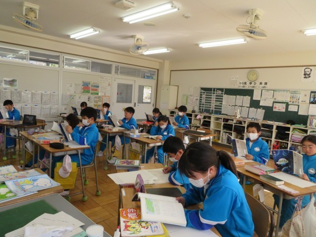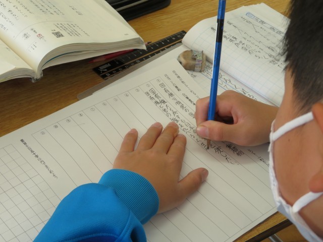 「固有種が教えてくれること」の学習に入りました。「ここでは」資料と文章を結びつけて読むことのよさなど、筆者の説明の工夫を探しながら読むことを学びます。また、自然環境について考えるきっかけをもつことにもつながります。今日は、段落ごとの要旨を表にまとめていました。段落ごとに分けることはもうできますが、あわせて、段落ごと、文章全体の要旨を短い文にまとめることができるようになっています。大まかに内容を捉えてから、細かく読み取りをしていきます。