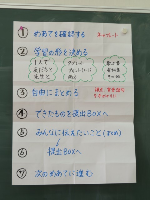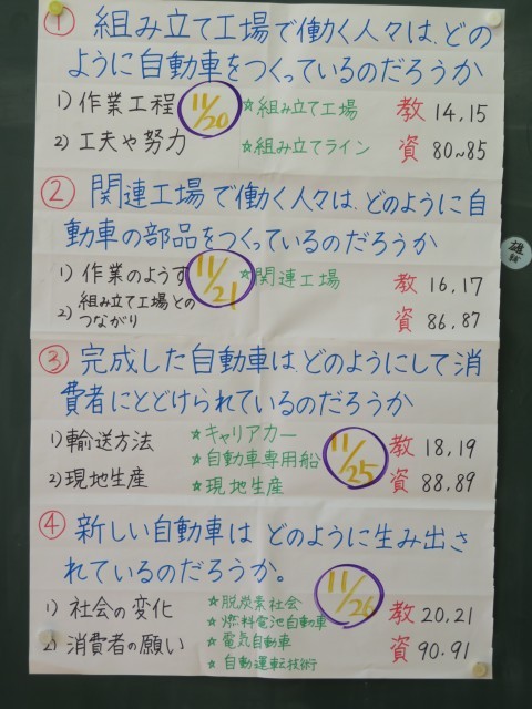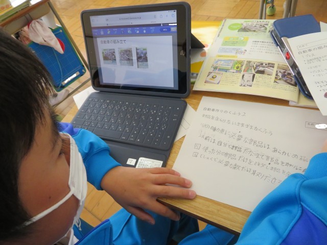 「自動車をつくる工業」の学習です。「ここでは」いつも以上に調べ学習を中心に学習を進めているようです。調べ学習の進め方は自分で決めます。そして、いいなと思うのは、学習したことについて、友達に伝えたいことがあるということです。自分の力で、自分の言葉で分かりやすくまとめ、大切なことをメッセージとして発信、そしてさらにそこから調べたいことが生まれる、この積み重ねによって、自分の力で学習課題を見付けたり解決したりできるようになってほしいです。