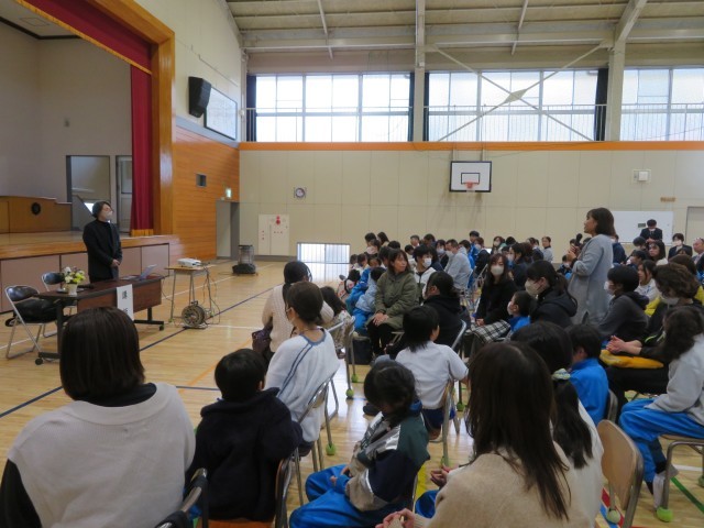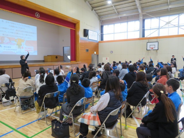 本日の授業参観は「親子で考える防災学習」を実施しました。全児童と保護者の皆様、地域づくりセンター美九里の呼びかけにより地域の方々にもお集まりいただきました。講師である群馬大学大学院理工学府の教授による1時間の授業では、児童も保護者も職員も地域の方々も、防災について大切なことを真剣に考えることができました。とにかく命を守るための知識や知恵を身に付けて、いざというときに適切な行動ができるようになること。これを日々の生活で意識していくことが大切であると痛感しました。また、家族で相談することがとても大切であるということも。学校でも、家庭でも、地域でも、今日の学びが命を守るための行動につながることができるよう、みんなで話をしていきましょう。
