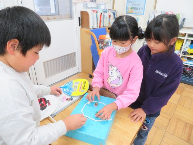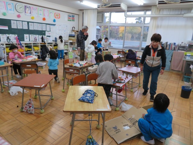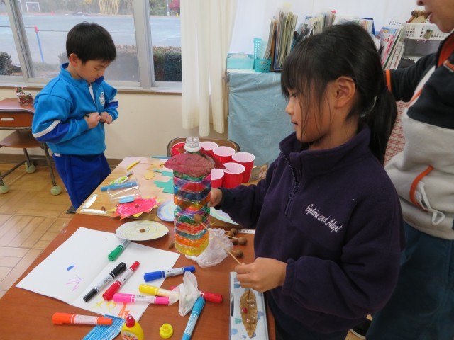 いっぱいいっぱいの秋のものに囲まれて、手作りおもちゃが完成に近付いています。来週、お隣さんの保育園の年長さんを迎えて一緒に遊ぶ計画をたて、準備しています。「たのしませてあげたいな!」の気持ちが最高潮に達しているので、本当に一生懸命つくっていました。身近なものでこんなにもみんなが「笑顔いっぱい」になれるなんて!ステキなことですね。