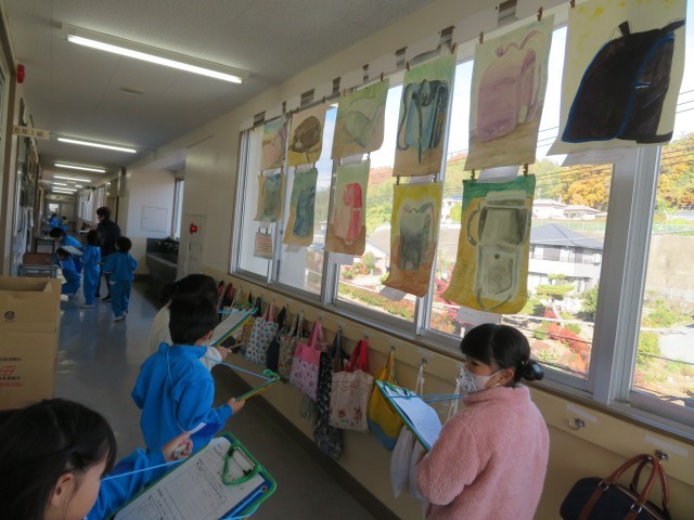 1年生は、「校内絵をかく会」の2~6年生の作品を見てまわっていました。自分の作品もとっても上手にできましたが、おにいさん、おねえさんの作品には「すごい!じょうず!」「こんなじょうずに かけるようになるんだね!」と驚いていました。1年生にとって、あこがれの、目標となる上級生の絵ですね。
