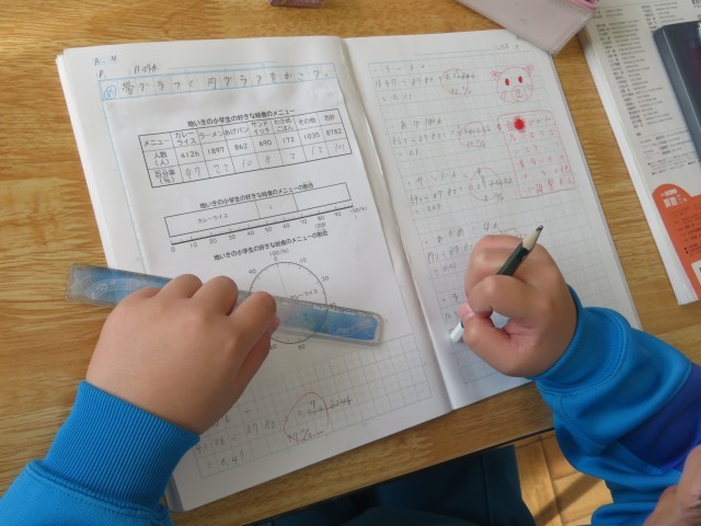 「帯グラフと円グラフ」今日は、表を見て、その内容を円グラフと帯グラフで表しました。百分率は?ひと目盛りは?割合が少ないものはどうやって表したらいいかな?実際にグラフにしてみると、円グラフと帯グラフそれぞれの特徴などがさらによく分かるようになりました。5年生は、手元の情報をどのグラフで表したらいいか?をしっかりと選択できるようになりました。