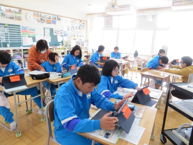 Unit 6「Save the animals」6年生は英語を通して、生き物のことを大切に考えています。「ここでは」生き物の暮らす場所や抱える問題(環境等とのつながりから)、さらには、自分ができることは何か?英語でスピーチができるようになっています。今日は、英語スピーチを作成していました。英文の正しい書き方等、ALTの先生にもよくみてもらった原稿(スライド)を作成します。自分が救いたい!調べたい!と考えた生き物についてなので、少し難しい英語でも「書きたい!」「伝えたい!」につながり、意欲的です。