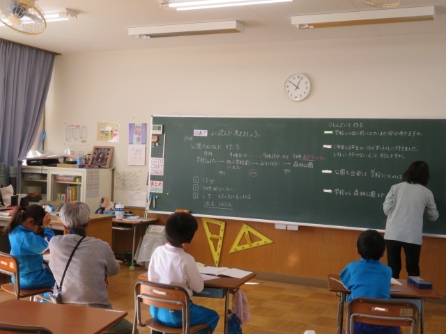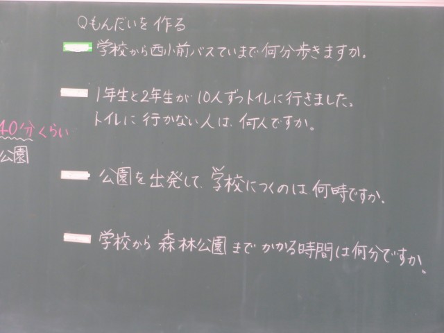 いつも算数の学習を「やる気いっぱい」一生懸命な2年生です。今日は、特にです。今日は、「読みとる力をのばそう」公園たんけんのしおりの中から必要な情報を選んで問題を作っていました。教科書や先生から指示された問題について考えるだけではなく、必要な情報を選んだり、いくつか情報を組み合わせたりして問題文を作るのです。こんな問題を作ってみたい!と思ったらできるまで頑張る2年生です。なかなかいい問題が出来上がりました。