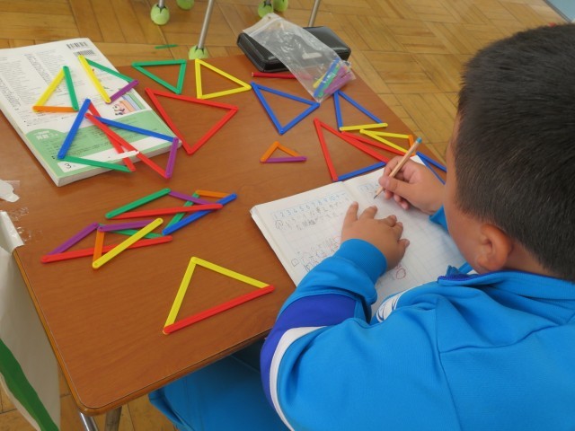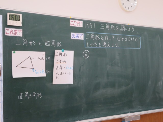「三角形と角」の学習に入りました。教室では、机の上に広がっているたくさんの三角形を「なかま分け」していました。「これまで」学習して知っている三角形のことを思い出して、仲間分けのポイントを考えます。どんなところに注目して、どんな仲間分けをしたのかについて、きちんと自分の言葉でノートに説明を書き始めたところですが、ちょっと難しそうでした。でもここでじっくり考えることが大切です。しっかり自分の考えをもってから友達の考えを聴いてみるようです。