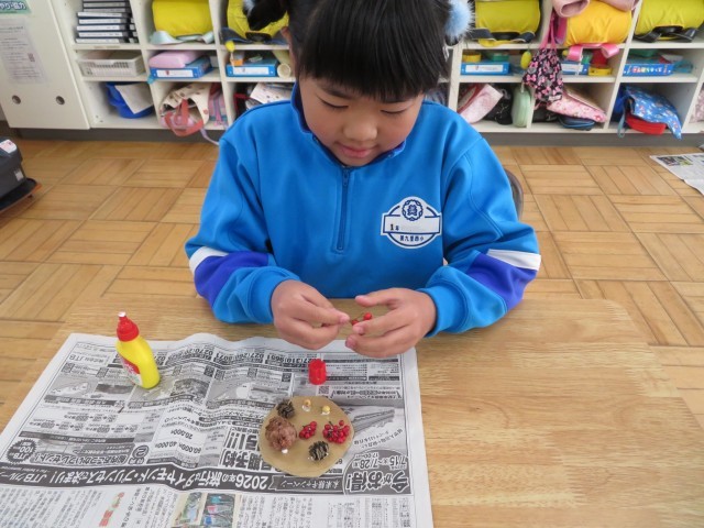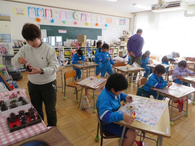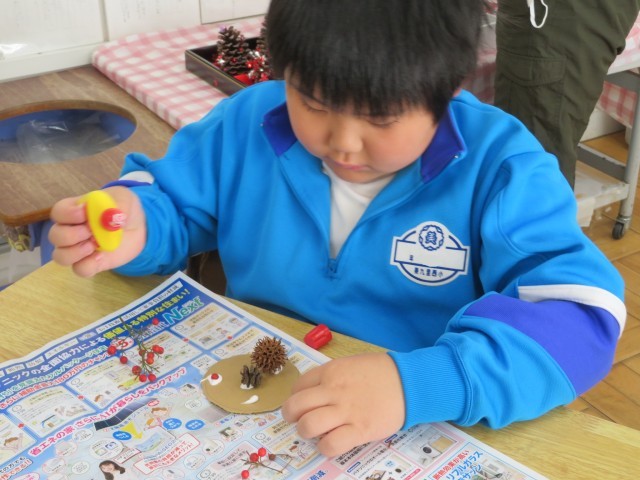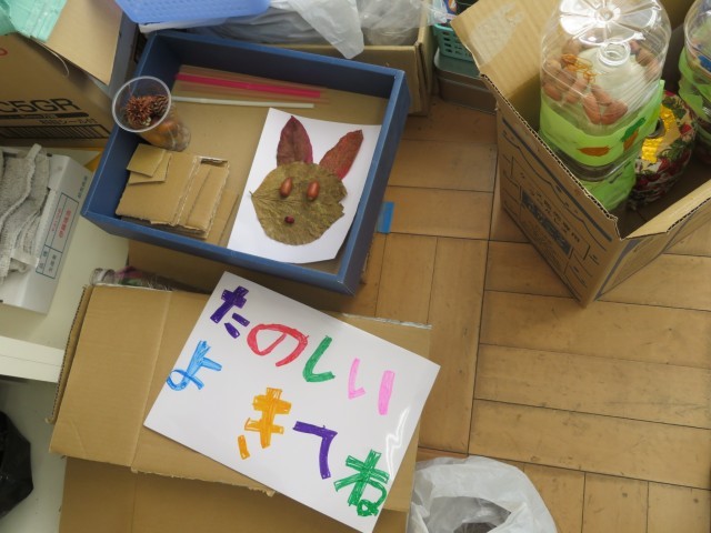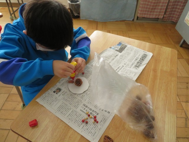 5日(金)に、おとなりの保育園の年長さんを迎えて「あきまつり」をします。秋のものをたくさん集めてきて、遊びが完成し、今日はプレゼントを作っていました。おにいさん、おねえさんになって年長さんを楽しませるために、一生懸命準備しています。準備している様子から、あたたかい気持ちのこもった会になることまちがいなし!そして、4月には、やさしいおにいさん、おねえさんになることもまちがいなし!
