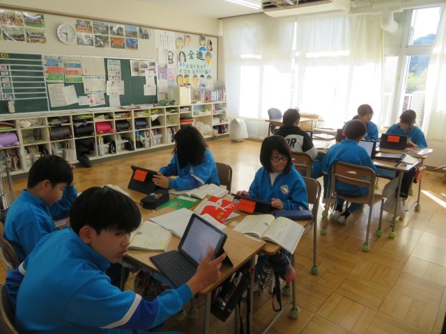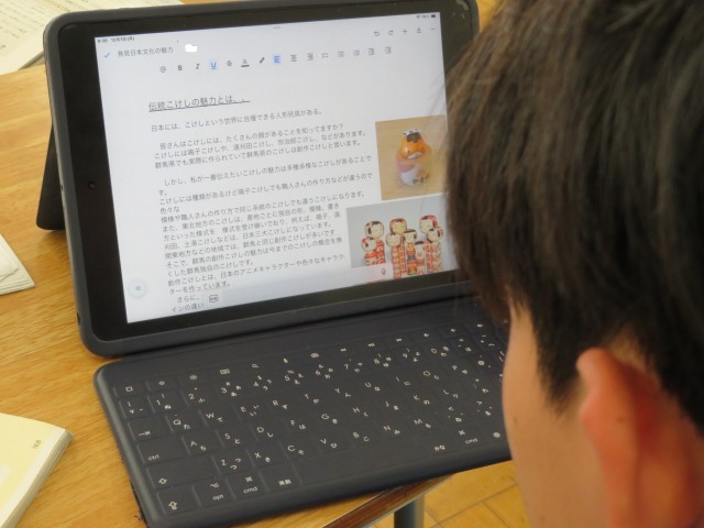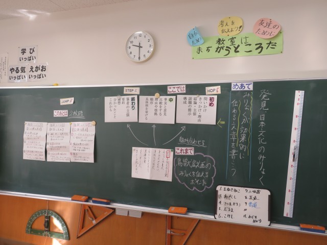 「発見、日本文化のみりょく」自分の選んだ日本文化のよさを伝える文章が完成しています。でもここからが大事です。今は「推敲」に時間をかけています。よさが伝わるような文章にするには?構成や言葉づかいはどうか?効果的な資料の入れ方は?簡潔に述べる部分と詳しく説明する部分は?などなど。この「推敲」には、「これまで」学習してきた様々な工夫の仕方を活用する必要があります。