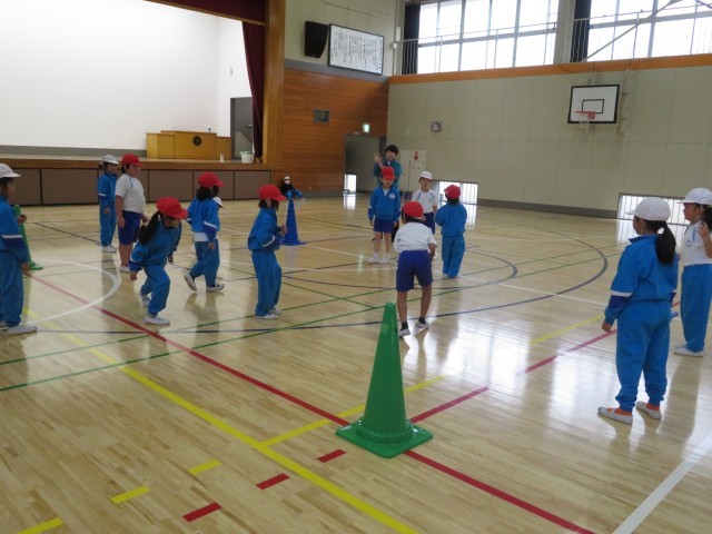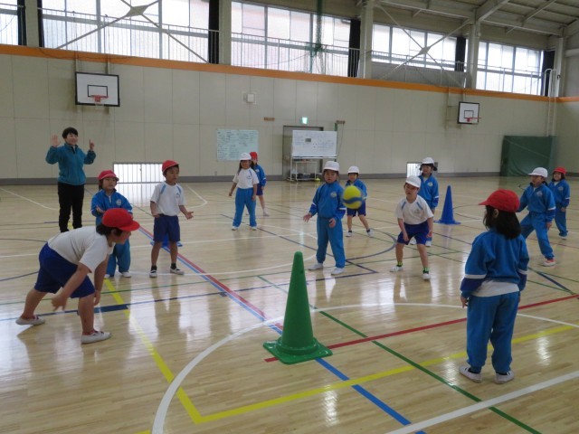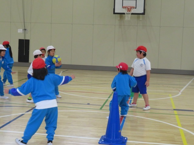 ボールを使った運動に慣れてきました。今日はゲーム形式のボール遊びを取り入れて、楽しそうに動いていました。ミニドッチボールです。ボールをとったらすぐにパスしたり、よく見てボールが当たらないように逃げたりと、速い判断はまだ難しいようです。でも大きなボールをしっかりキャッチしたり投げたりすることができるようになってきています。「ここでは」ボールを使って友達と一緒に仲良く運動することの楽しさをたくさん味わってほしいです。