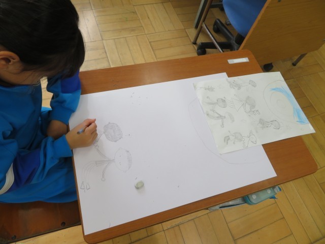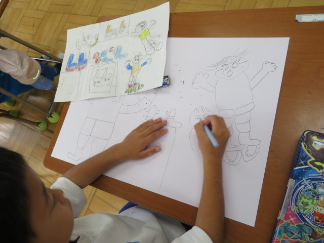 「絵をかく会」での「おいもほり」の絵がみんなそれぞれとても上手にできた2年生、今度は「読書感想画」に挑戦です。本が大好き!な2年生なので「やる気いっぱい」です。自分のお気に入りの本の世界を「ここでは」絵で表現します。大きな画用紙いっぱいに、まずは下絵をかきます。こんな世界を表現したい!思いを十分に表現するために、先生から大切なアドバイスをもらっていました。