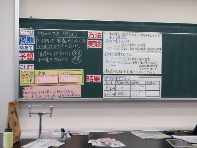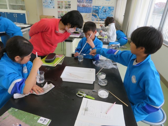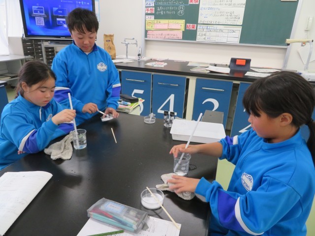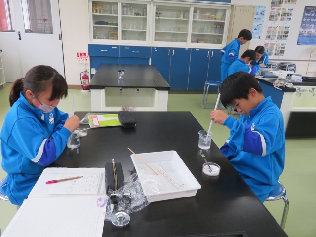 「物のとけ方」で今日の問いは「とけ残った食塩やミョウバンをとかすにはどうしたらよいか?」です。「ここでは」水の量や温度を変えて、つまり5年生で大切な「条件を整えて」実験していました。水の量や温度の違いによる物のとけ方、ものによって溶け方に違いがあることなどが実験を通して分かります。5年生の実験を見るといつも感心するのは、みんなが安全に実験できるように気配りがとてもよくできます。全員ができます。今日は雑巾が大活躍です。テーブルや床が少しでも濡れるとすぐに雑巾でふきとっていました。こういう雰囲気の中だからいつも学習が充実できるのだと思いました。