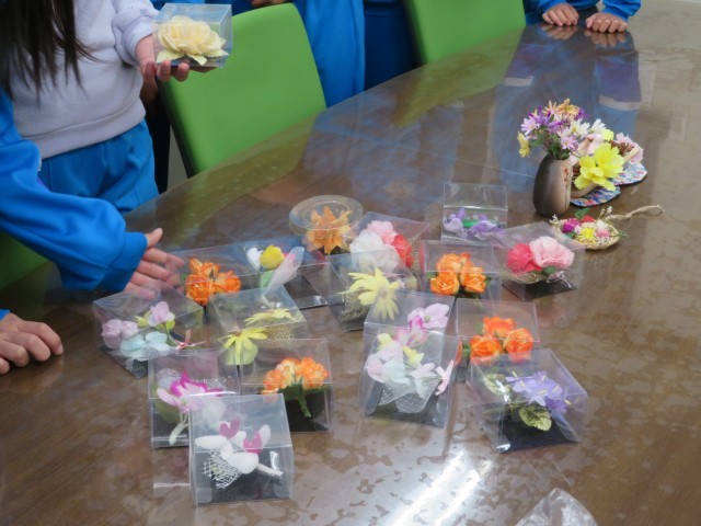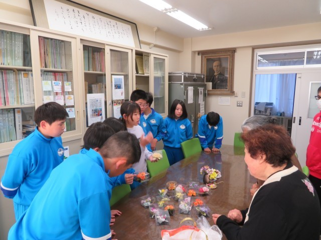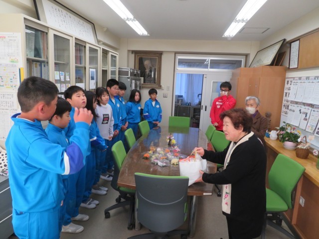 毎年、6年生が卒業式に胸に飾るのは手作りの「繭花コサージュ」です。更生保護女性会美九里支部の方々に教えていただき、親子で作ります。4年生が愛情込めて大切に育てたお蚕様が作り出した繭が、先日6年生の手に渡り、今日は、お世話になる更生保護女性会美九里支部の方々にお渡ししました。このあと、コサージュ作りの準備を進めてくださるとのことです。高山社跡のある地域で育った6年生の晴れの門出を飾るのは、やはり「まちのたから」である繭と、同じく「まちのたから」である地域の方々の思いでなのですね。ありがとうございます。