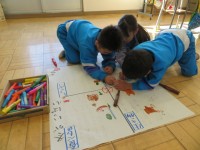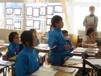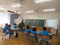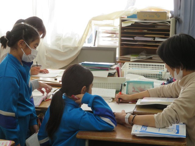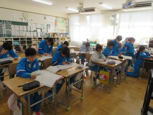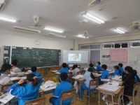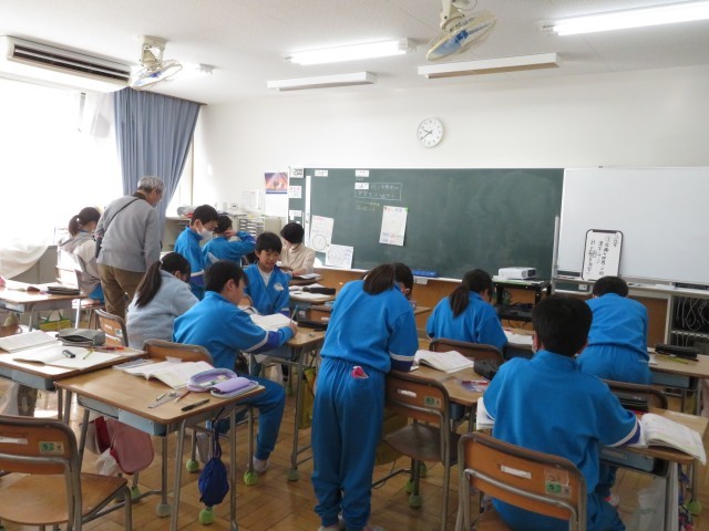 今日のめあては「正多角形と円の学習を振り返ろう」です。教室ではいくつかの課題に順に取り組んでいました。5年生は自分の力で解決しようと頑張れる学級です。そこにもちろん友達同士の学び合いが効果的に働いていることは確実です。決して答えを教えるのではなく、友達が自分の力で考えられるようにアドバイスします。「ノートを見返してみるといいよ」お互いに高めあえる学級ですね。