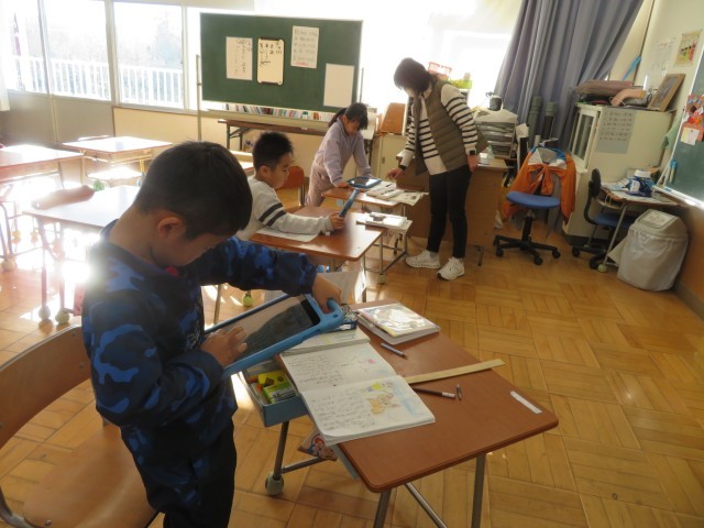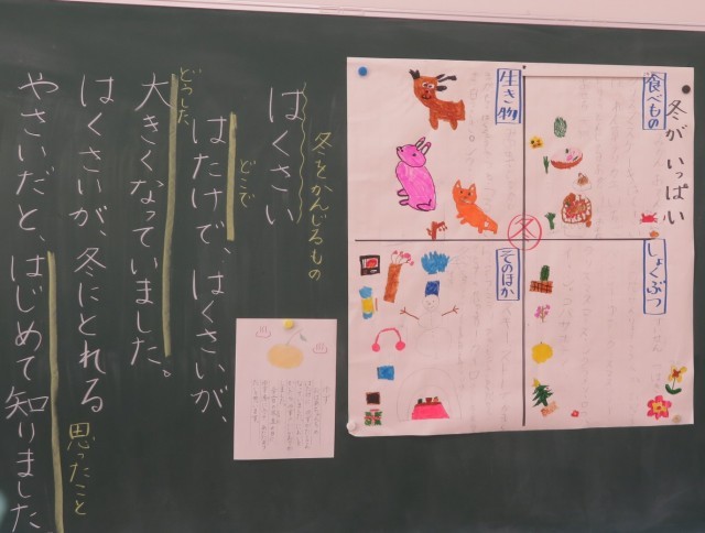「冬がいっぱい」昨日みんなで頑張った「冬のことば」を見ながら、冬を感じるものを選んでカードに文と絵でまとめました。自分がつくったカードはタブレット上でお友達にも見せます。カードをつくるときに参考になったのは、教科書の「はくさい」だけでなく、先生の「ゆず」のカードがとても参考になりました。楽しい冬を、言葉で、文で楽しんでいます。すてきですね!ぜひ、冬休みに家族でも楽しんでね!
