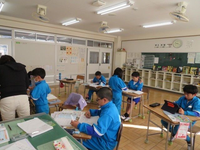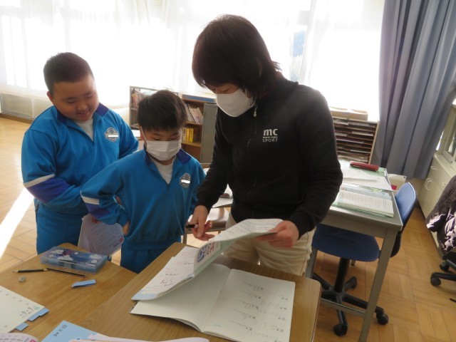「これまで」学習してきたことを総復習しています。様々な課題に取り組み、できたら次、その次は・・・、どんどん課題に挑戦していました。優しく分かりやすく友達に説明している児童もいました。3年生は「100点とりたい!」意欲がとても高いので、先生に○をつけてもらって嬉しそう、間違えるとちょっと悔しそう。でもそれが大きな力につながります。