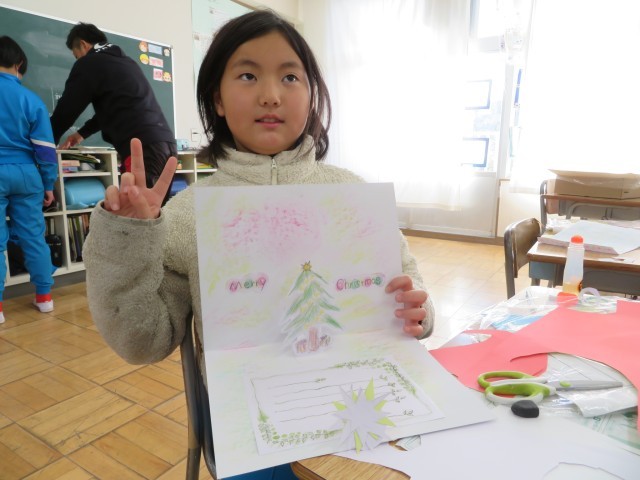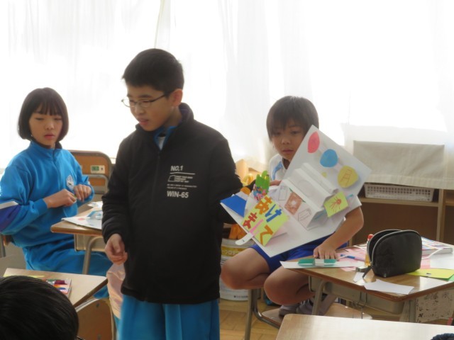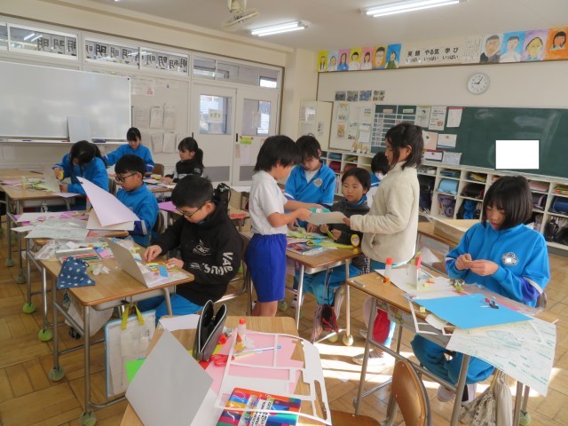 「幸せを運ぶカード」素敵な学習ですね。「ここでは」伝えたいことや伝える人の気持ちを思い浮かべながら、仕組みや材料などの工夫を加えて、気持ちのこもったカード作りをしています。一人一人のカードを見ましたが、ここではあまり多くを細かく紹介するのは控えます。(サプライズもあるようですので)こうやって誰かのことを思いながら、心を込めて作っている児童を見て、心が温かくなりました。もっと工夫を加えてみたい!と友達の工夫から学ぼうとしている学級の雰囲気にも感心です。
