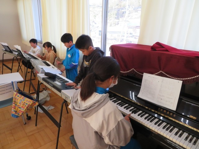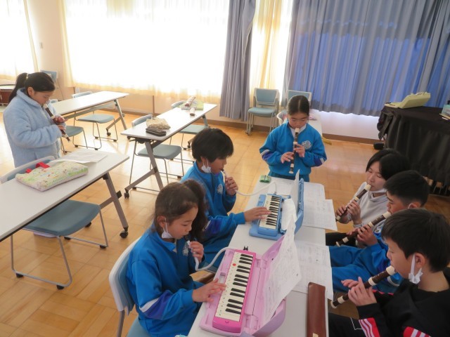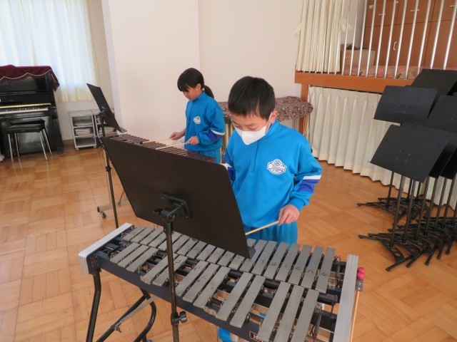 曲名は「キリマンジャロ」。「ここでは」曲想の変化を生かした合奏を目指します。ちょうど音楽室では、それぞれ個人練習中でした。5年生にもなると、休符やスタッカートなどの音楽記号をよく理解して演奏することができます。また、曲想と自分(みんな)の思いや気付いたことをつなげて考え、演奏に生かすこともできるようになっています。みんなで合わせる合奏を楽しみにして、十分に練習しています。