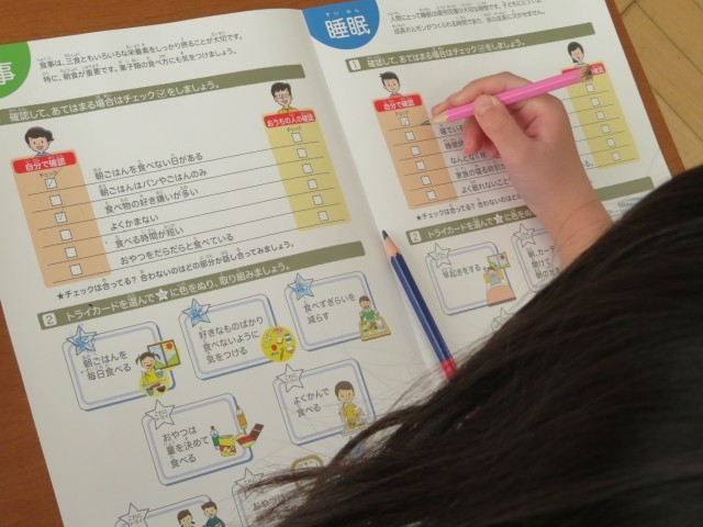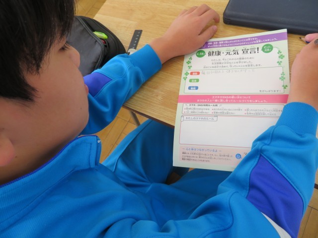 もうすぐやってくる冬休み(以降もずっと)を健康で元気に過ごすため、運動、食事、睡眠の3点について具体的に自分自身の生活をチェックします。そして、そのチェックをもとに、よいことは続け、そうでないことは改善するために、自分自身のチャレンジを「健康・元気宣言」として決定しています。