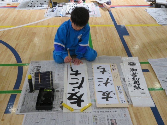 3~6年生は体育館で。広い体育館の中は、シーンと静かな雰囲気が漂い、全員が集中して自分の字と向き合っていました。2学期からずっと児童の書道をサポートしてくださった東クローバーのボランティアの方々から温かいメッセージをいただいたり、アドバイスをいただいたりしました。ありがとうございました。新年の始まりに、一人一人が自分の思いを込めて真剣に書いている姿を見て、心動かされました。