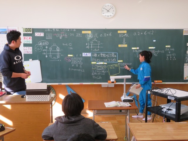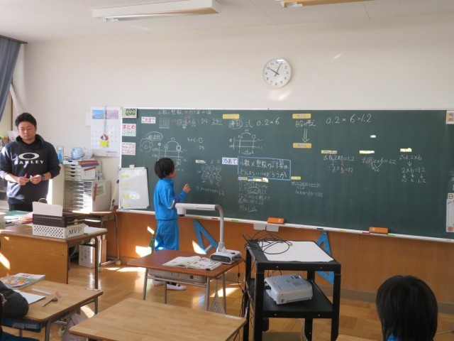 3学期の算数は「小数と整数のかけ算」からスタートです。今日は、「0.2×6」の計算の仕方を考えました。「これまで」同様、いくつ分?の考え方を使ったり、計算のきまりを思い出して考えたりしており、一人一人が自分の考えをもったあと、友達の考えも知ります。友達が自分の考え方をよく説明するのをしっかり聴いて、新しい考え方を学びます。とても感心したのは、一人一人が友達の説明を、自分の考え方との違いや共通点を考えながら聴いていたこと、さらに反応があることです。だから「ここでは」の学習はどんどん深まっていくことでしょう。
