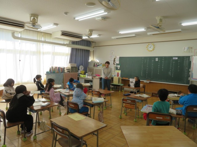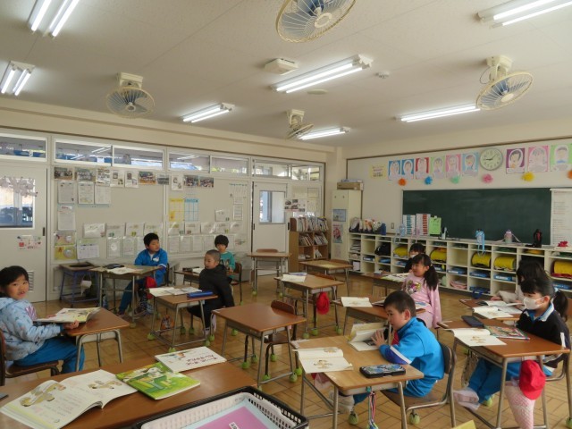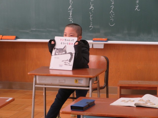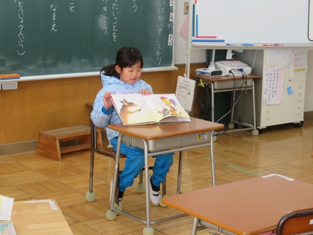「くわしく きこう」教室では自分の大好きな本を友達に紹介しているところでした。「ここでは」好きなお話の紹介を通して、詳しく聞きたいことを考えながら聞くことを学びます。「ブレーメンのおんがくたい」を紹介していた児童に、ある児童が「いろいろな本があるけど、どうしてその本なの?」と質問したところ、この作家さんの本が好き!と答えていました。1年生は本が大好きなのですね!「ここでは」の学習をきっかけにして、さらに読書の輪を広げてほしいと思います。