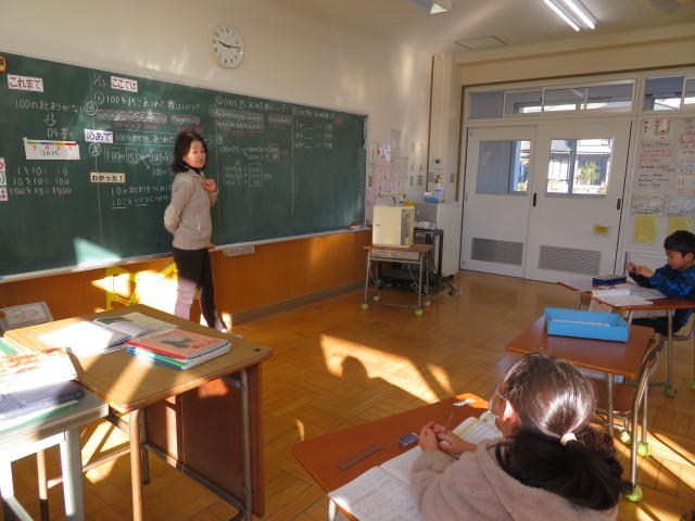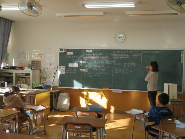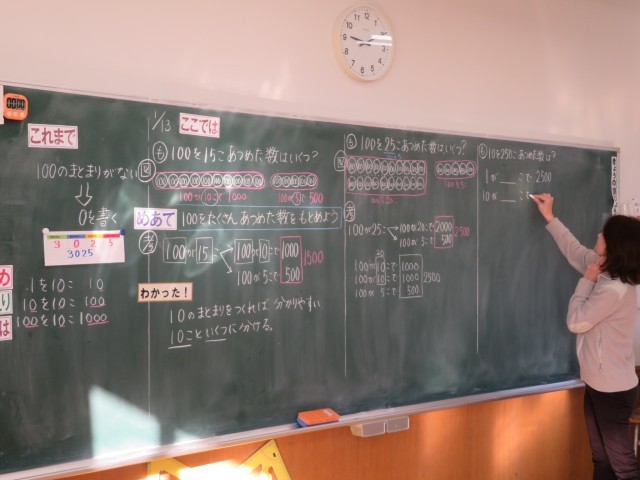 「1000より大きい数」の学習です。今日は100をたくさん集めた数について考えていました。ちょうど教室では2500という数について考えていました。「100を25個集めた数」はもちろんですが、「1を2500個」「10を250個」もばっちり理解していました。学ぶ数が大きくなっても、こうやっていろいろな見方で数を表すことができるようになっています。