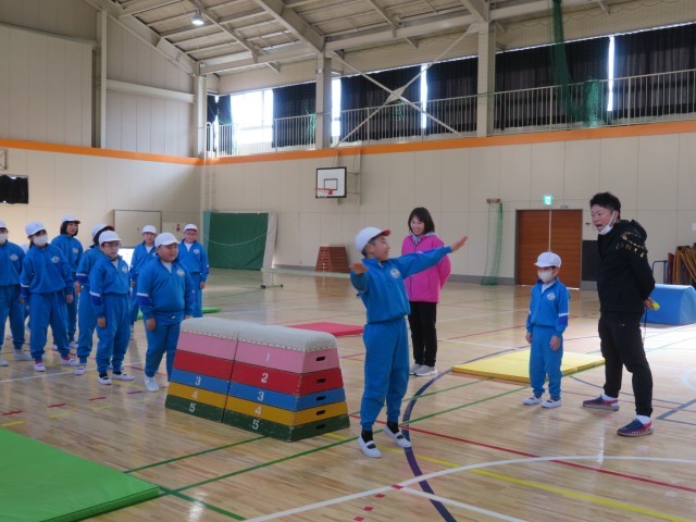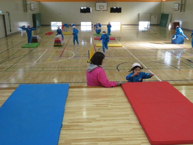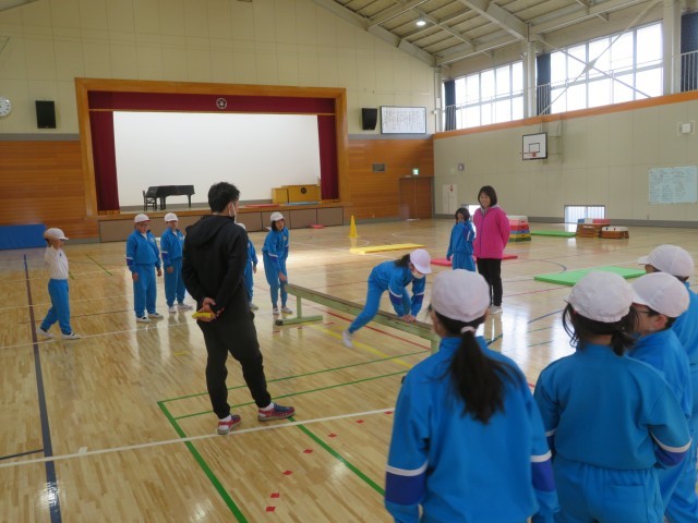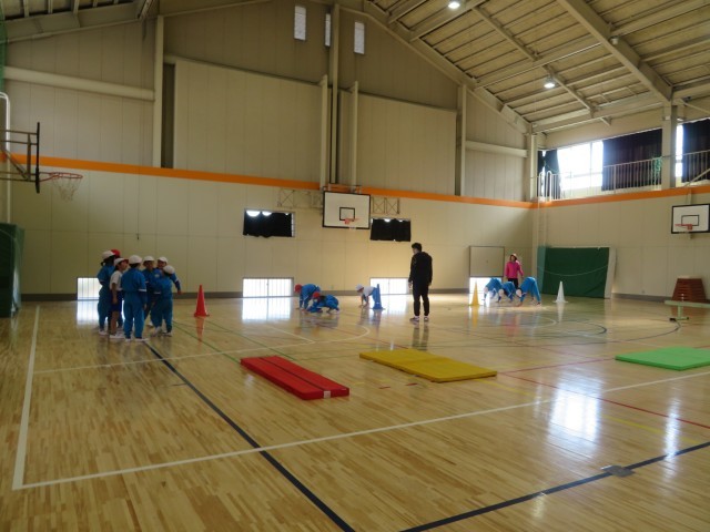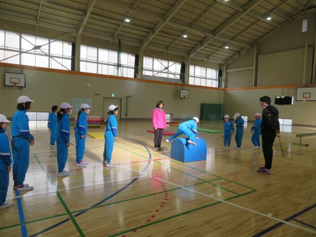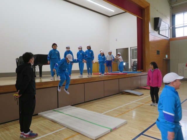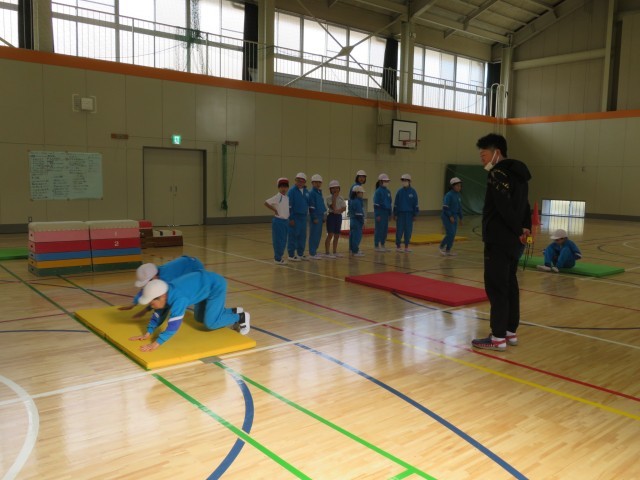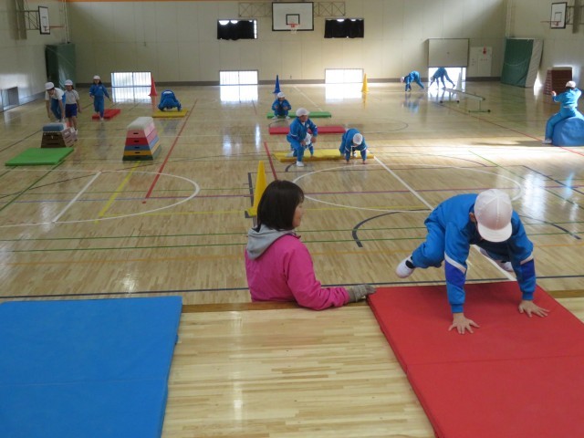 「とび箱」の学習が始まりました。今日は体育館いっぱいに並べられたマットやとび箱などいろいろな用具を使ってのサーキットを楽しんでいました。どの動きも「ここでは」とび箱の運動の基本的な動きばかりです。先生からは、安全第一の行動とともに「一つ一つの動きを丁寧に」の指示がありました。安全に、恐怖心なく、おもいっきりとび箱をとべるためにも、とても大切な準備をしています。