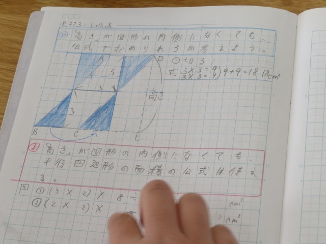「四角形と三角形の面積」の学習中です。今日は四辺形の面積の求め方についての学習を深めました。昨日の学習とは違って、今日は、高さが図形の内側にない場合です。でもいつも通り公式が使えることが分かりました。どうして公式が使えるのか?きちんとその説明ができるように図形を切り取ったり動かしたりしてじっくりと考えたからこそ、学習が深まったと言えます。