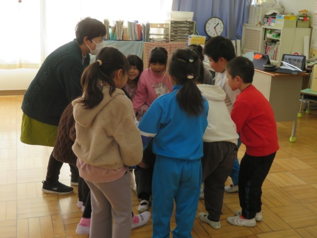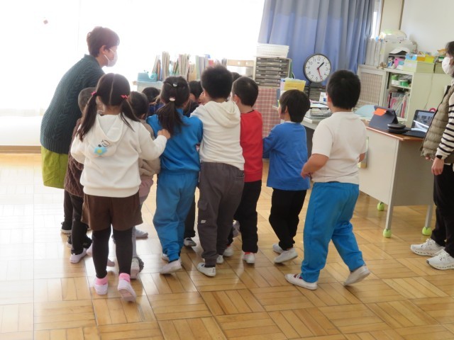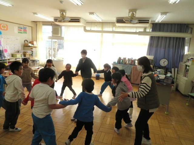 はないちもんめ、あぶくたった、なべなべそこぬけ、おちゃらかほい、あんたがたどこさ・・・などなど。いくつもの「わらべうた」を楽しく歌って遊んでいました。昔からずっと日本の子供たちに親しまれている大切な文化です。歌を通して、音楽を通して友達と仲良く遊んだり、新しい友達をつくったりすることができたらすてきですね!家族や地域でも、世代を超えてそんな遊びが楽しめたら、さらにすてきですね!