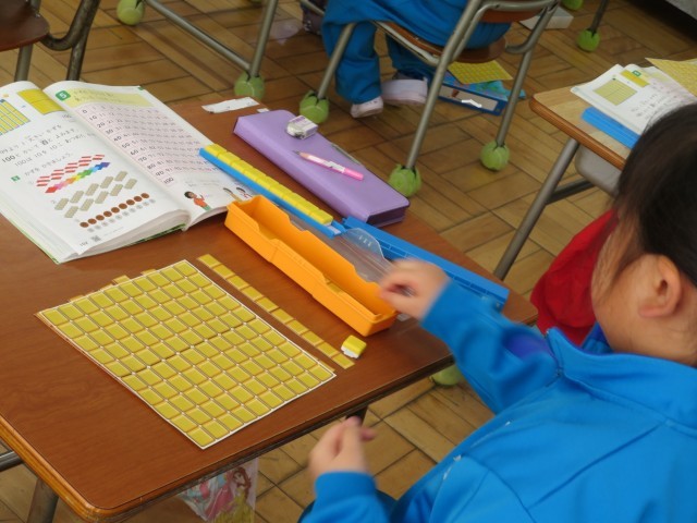 「大きなかず」の学習です。「これまで」学習してきたのは99までのかず。「ここでは」その99に1をたすと「100(百)」の数との出会いです。教室では先生が言う数をブロックで表していました。みんなとてもよくできるので、先生が200は?と聞くと、100のかたまりを2つ、正しく机の上に並べることができました。