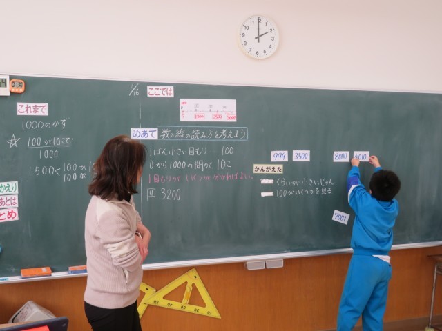 「1000より大きい数」の学習です。今日は、数の線の読み方を考えたり、数の大きさの比べ方を考えたりしました。教室ではちょうど、5つの大きな数字を小さい順に並べ替えているところでした。数字を読んでみれば分かりますが、どうやって考えたらいいのか?を言葉にするのは少しハードルが上がりました。でも考えたことを一生けんめい発言できるのが2年生!(いつもそう思います)そして、考えてみると、「数の線はべんりだなあ!」そう思いました。