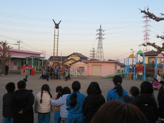 お隣の美九里西保育園さんからお誘いいただき、藤岡若鳶会の方々による「新春はしご乗り」を見学させていただきました。学童に通っている児童が多く、職員も保護者も皆で楽しませていただきました。約6mのはしごの上で華麗な技をいくつも見せていただき、驚きの連続でした。これは新春を祝うための、日本で大切にされている伝統芸能です。貴重な機会をいただき、ありがとうございました。