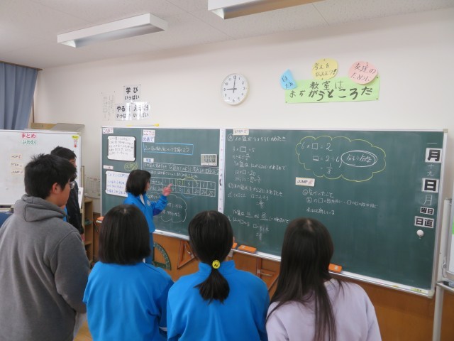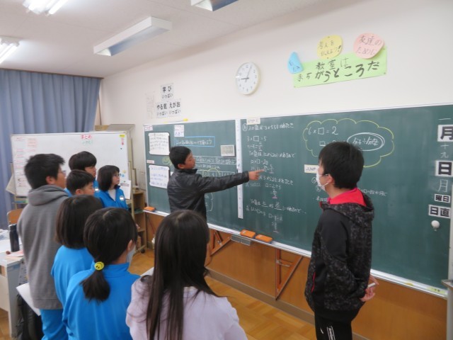 「比例と反比例」の学習中です。今日は比例している2つの量の変わり方を詳しく調べました。「ここでは」比例の関係にあることを表す表からXの2つの値とそれに対応するyの値の割合はいつも同じであることが分かりました。「これまで」5年生のときに学習してきた比例の性質をさらに深めています。また今日は、ここでの学びをしっかり言葉で表現することもできました。ただ分かったことを説明するのではなく、2つの数量の関係について比例の特徴として詳しく説明することができました。