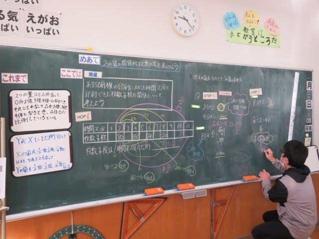 「比例と反比例」の学習です。今日は、比例する2つの量の関係を式に表します。yは「決まった数×X」の式で表すことができること、そして教室では、「X×決まった数」とならないのはどうしてか?を考えていました。「これまで」ずっとかけ算の考え方として「1つ分×いくつ分」が定着してきているので、すんなりと正しい考え方にたどり着きました。