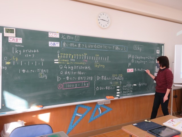 「重さの単位」今日は、はかりの目盛りを正しくバッチリ読むことができるようになりました。はかりによってはかれる重さが違ったり、一目盛りの大きさが違ったりするので、まずは一目盛りの大きさがいくつなのか?を考えることが大事ということに気付きました。一目盛りが何グラムを示しているのか?それをきちんと言葉で説明することができました。とても大切なことです。