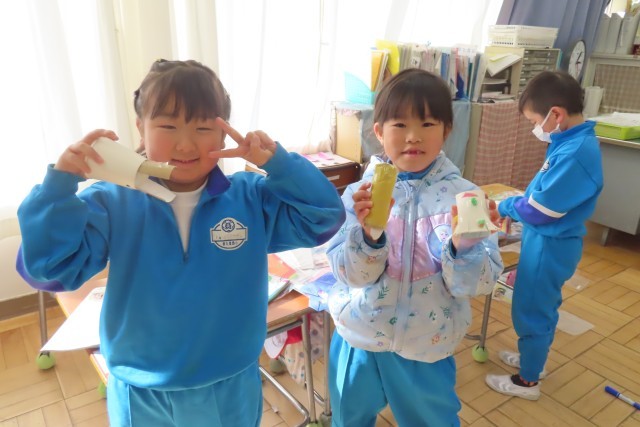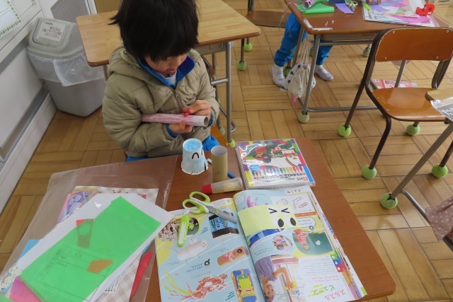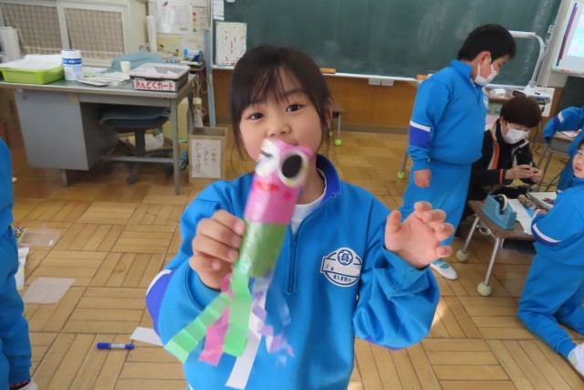 「スルスルビューン」紙コップやトイレットペーパーの芯などを工夫して、「ここでは」すべる仕組みを考えてすべらせたいものを作って遊びます。鳥やお魚、赤とんぼうやくらげ、「たぬきの糸車」のたぬきさんなどなど。とても楽しそうでした。とても感心したのは、その飾り付けに使っているのはこれまでの図工で使った材料です。大切にとっておいて活用しています。身近にあるものや大切にとっておいたもので、こんなにも充実した学習につながるなんて!感心しました。