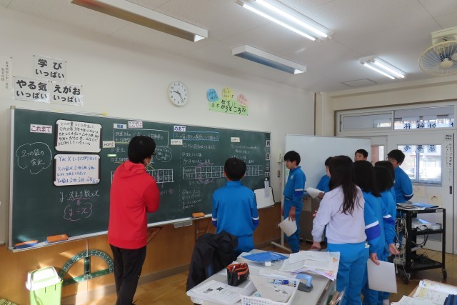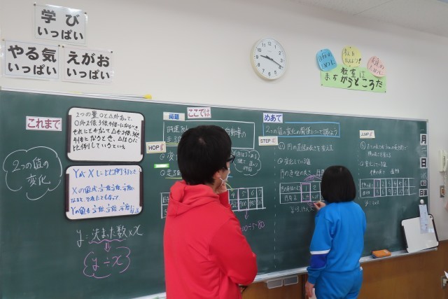 「比例」について、今日は3つの課題について、ともなって変わる2つの数量を見付け、表をもとに比例の関係になっているかどうかを調べました。そしてyがxに比例するとき、y=決まった数×xであることをきちんと理解し、正しく式で表すことができるようになっています。様々な場面で、比例関係にあるものを見付けることができると思います。そんなとき「ここでは」学んでいる比例の特徴を活用して問題解決ができるようになったら嬉しいですね!