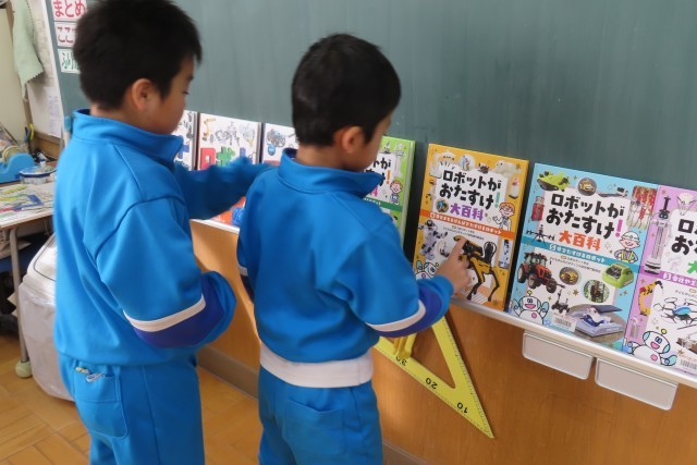 「ロボット」の学習です。「ここでは」大事な言葉は何かを考えながら読んで、分かったことや思ったことを友達に伝えることが上手になっています。そして今では、他にもロボットについて知りたいな!と興味津々です。教室には何冊ものロボットに関する本があって、真剣に読んでいます。「あったらいいな!」と思うロボットを見付けて、友達に紹介したいことを整理していました。